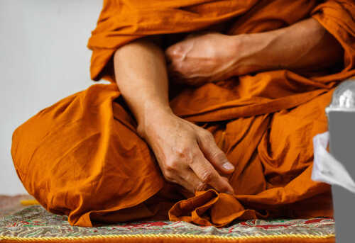 A close-up of a Buddhist monk's hand resting on orange robes during meditation